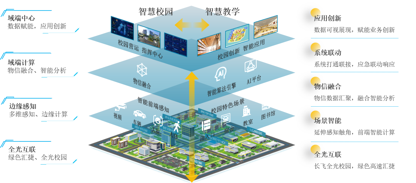 教育部2018年发布的《教育信息化2.0行动计划》一文中明确指出,现阶段我国的教育信息化工作是以“三通两平台”为基础,到2022年基本实现“三全两高一大”的发展目标。美嘉体育公司智慧教育解决方案可提升学校的智慧教学信息化水平,助力构建“互联网+”条件下的人才培养新模式:在接入层,聚焦以AI识别算法为基础的安全校园和以窄带物联网为基础的智慧环境,缓解学校管理层面临的长期管理痛点;在应用层,聚焦基于大数据为核心技术的个性化学习和泛在自适应学习,助力每个学生精准提分。